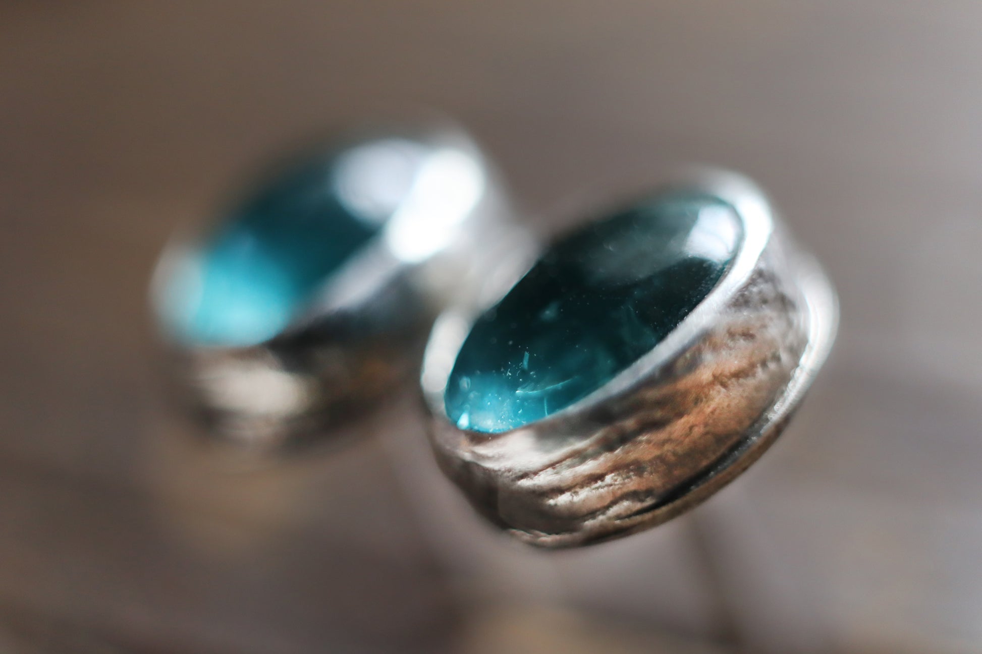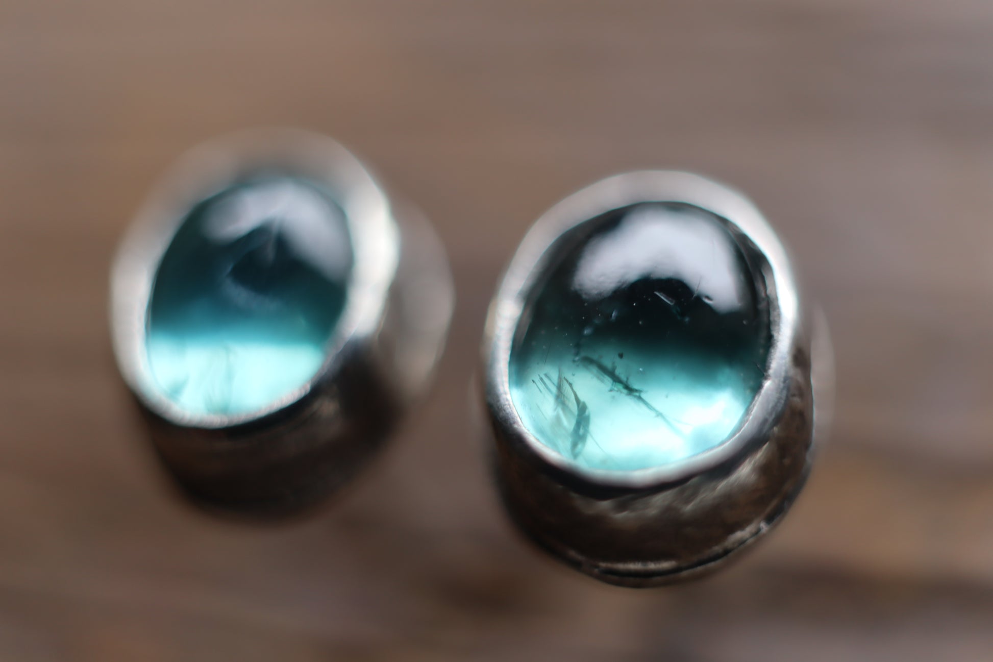 Sterling silver textured fine silver bezel, set with natural sea aqua kyanite. Finished with a patina to accentuate the texture of the bezel.